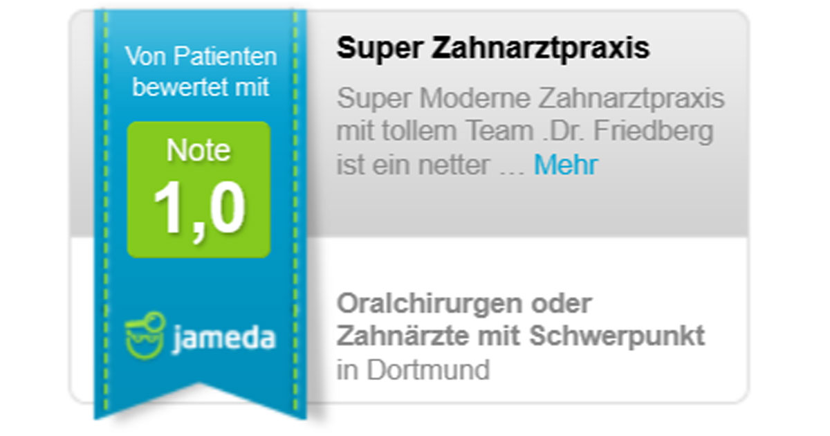 Die Zahnärzte am Phönixsee belegen den 4. Platz im Ranking der TOP-Zahnärzte in Dortmund - vielen Dank an all unsere Patienten für diese Wertschätzung! Wir nehmen das als Challenge an & wollen noch besser werden, für unsere Patienten! Bewerten Sie uns auf jameda!