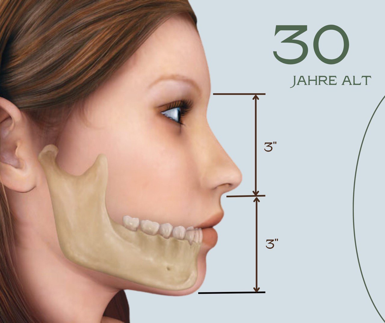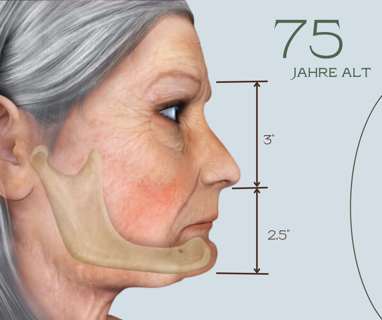 Und es geht leider weiter. Nachdem der Alveolarknochen verloren gegangen ist, beginnt auch der Knochen darunter, der Basalknochen – der eigentliche Kieferknochen – zu resorbieren (zu schrumpfen). Der Abstand von der Nase zum Kinn nimmt ab und damit bricht das untere Drittel des Gesichts teilweise ein. Das Kinn dreht sich nach vorne und nach oben, und die Wangen, welche die Zahnunterstützung verloren haben, wirken hohl. Extremer Knochenschwund führt oft zu Kieferfrakturen, da Knochenvolumen immer mehr abnimmt.